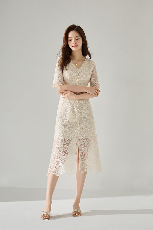 23% İndirim%90 Pamuk Dantel Zarafeti Ekru Zarif Elbise