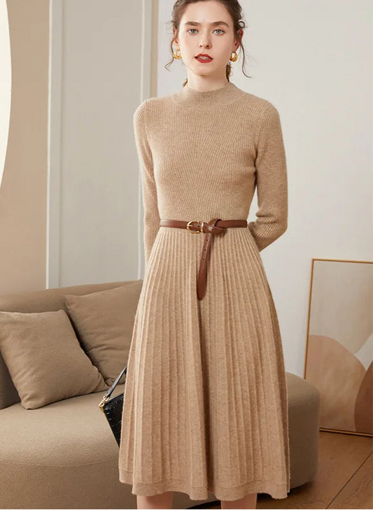 %100 Kaşmir Örgü Zarif Balıkçı Yaka Pilili Yumuşak Elbise