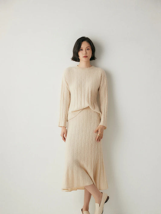 %100 Kaşmir Minimalist Stil Burgu Örgü Kazak ve Pilili Etek Takımı