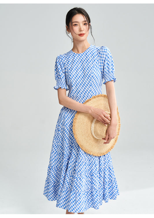 Mavi Beyaz Ekose Tasarımlı Beli Vurgulayan Midi Uzun Elbise