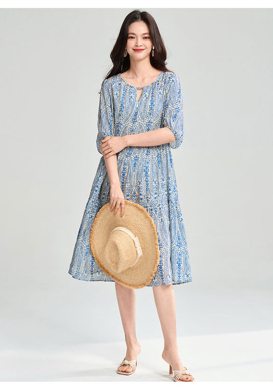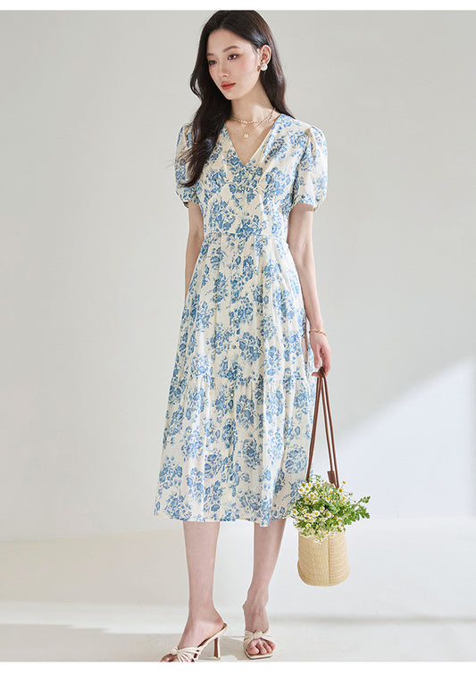Mavi Çiçek Desenli Fransız Stil V Yaka Bağlamalı Yazlık Elbise