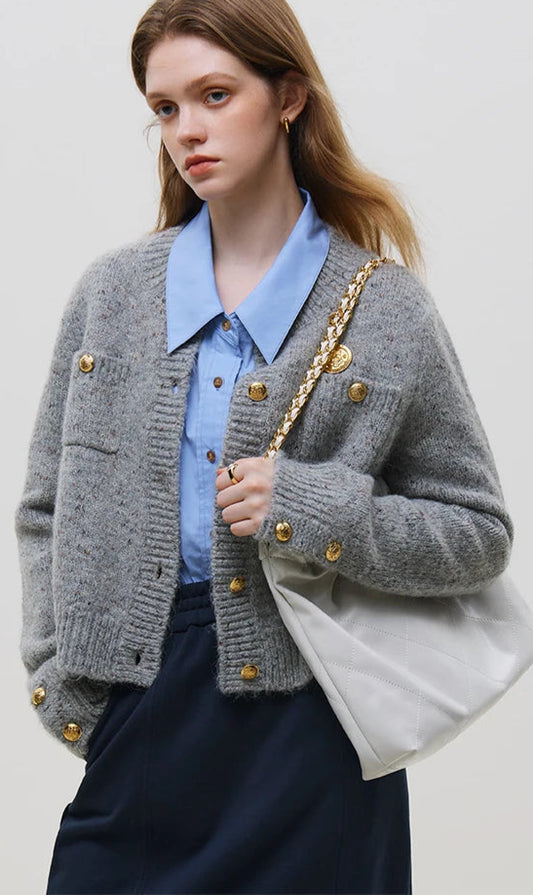 Metal Düğmeli Yuvarlak Yaka Kalınlaştırılmış Hırka