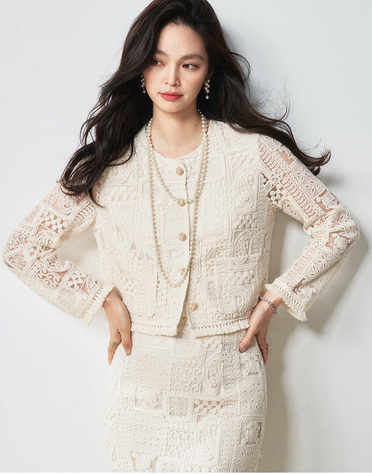 16% İndirimLüks Hollow Detaylı Bej Püsküllü Etek Üst Takımı