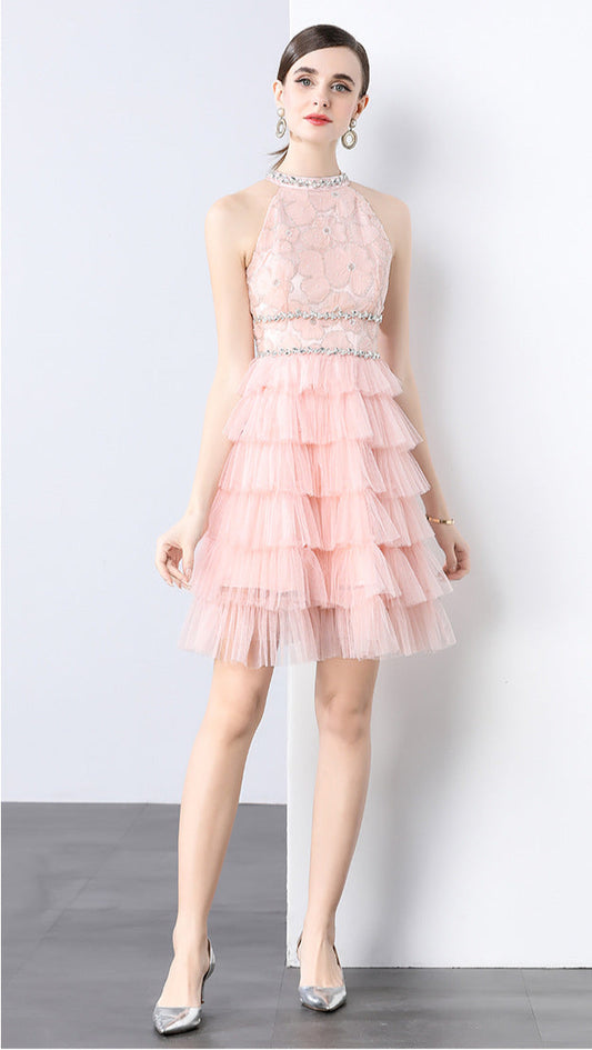 21% İndirimKristal Taşlı Halter Yaka Kat Kat Tül Elbise