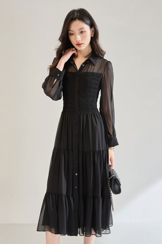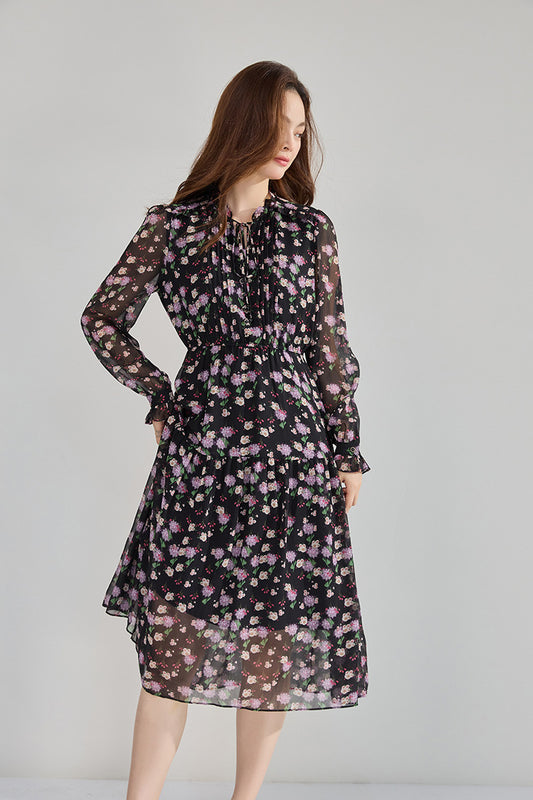 Siyah Çiçek Desenli Fırfırlı Yaka Uzun Kollu Şifon Elbise