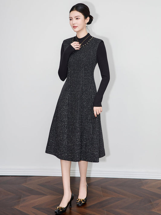 Zarif Dokulu Chanel Esintili Midi Elbise