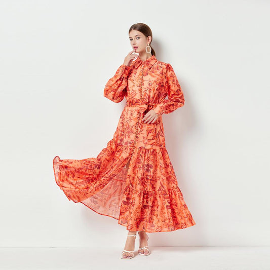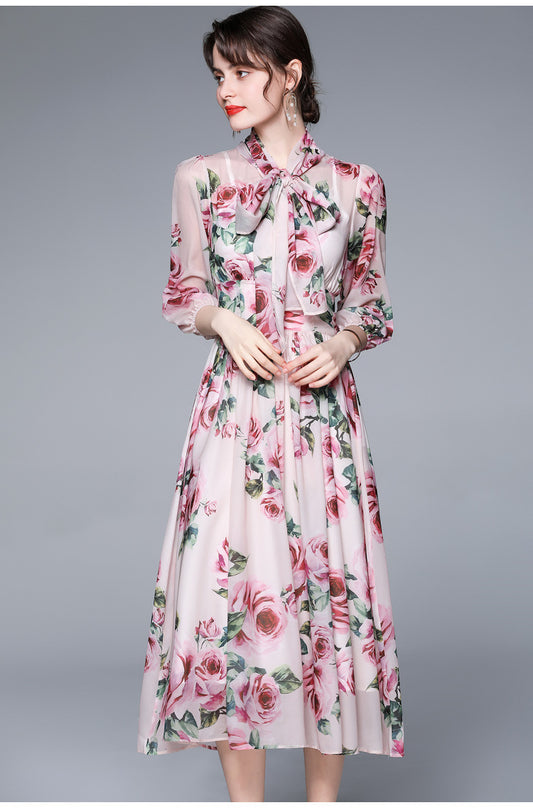 Bağcıklı Yaka Çiçek Desenli Uzun Elbise