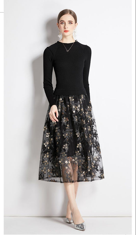 Triko ve Tül Detaylı Katmanlı Uzun Elbise