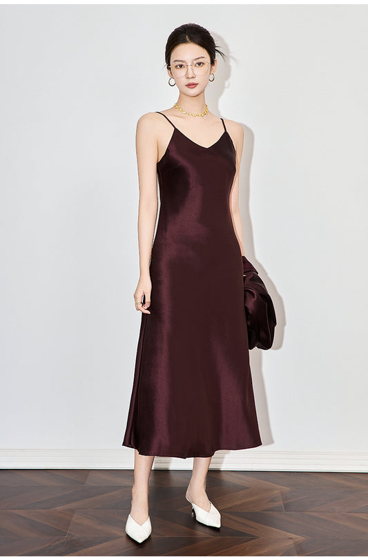 Saten Dokulu Askılı Asetat Elbise