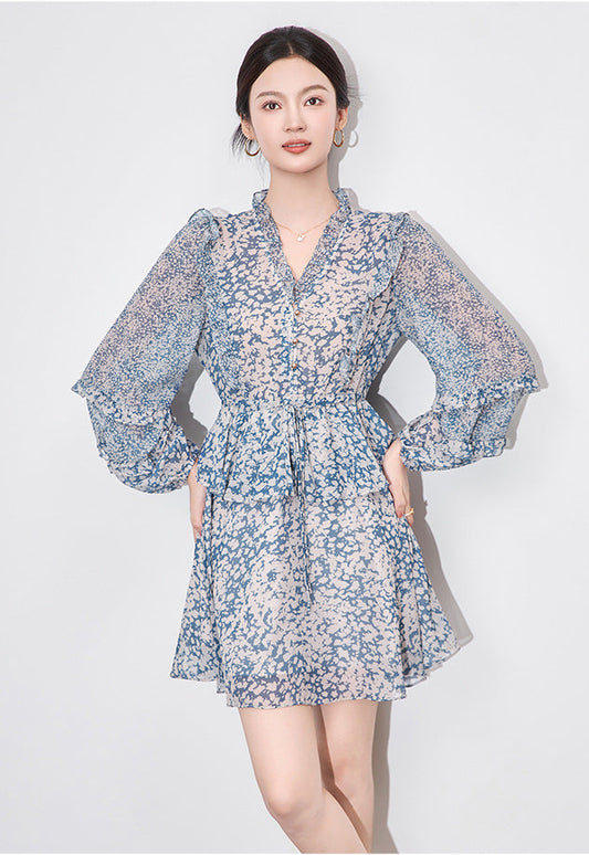 Bel Büzgülü Uzun Kollu Mini Şifon Elbise