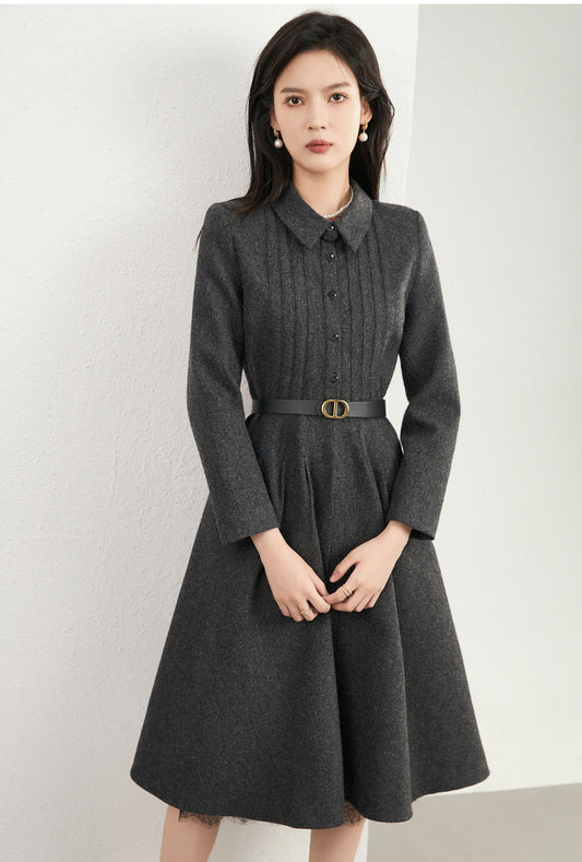Yün Harmanlı Balıksırtı Dokulu A-Kesim Fransız Elbise (Kemer Haric)