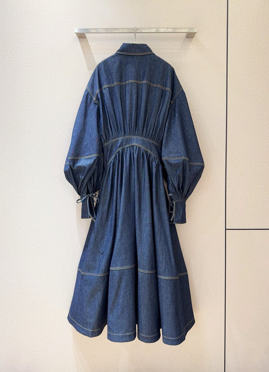 Asimetrik Etekli Balon Kollu Jean Elbise