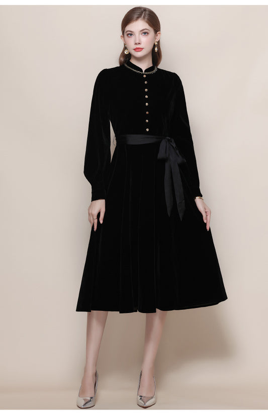 Vintage Kadifemsi Dokulu Siyah Elbise