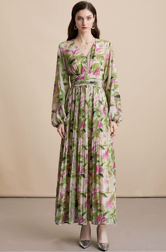 21% İndirimVintage V Yaka Çiçek Desenli Uzun Elbise