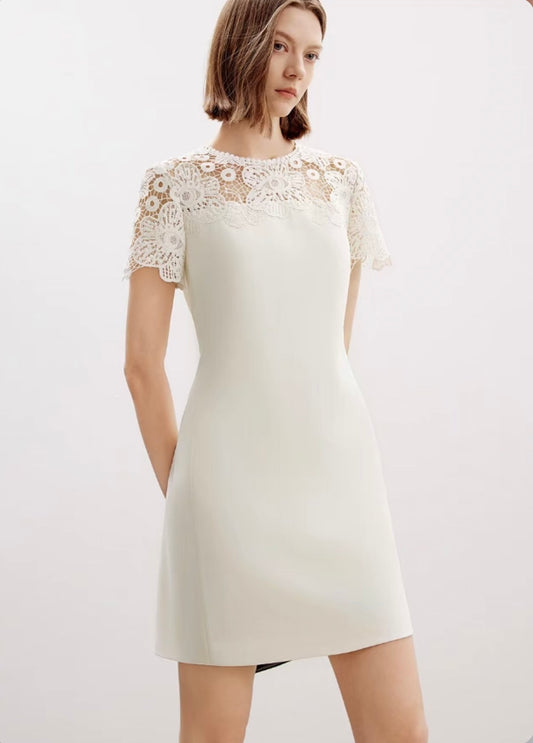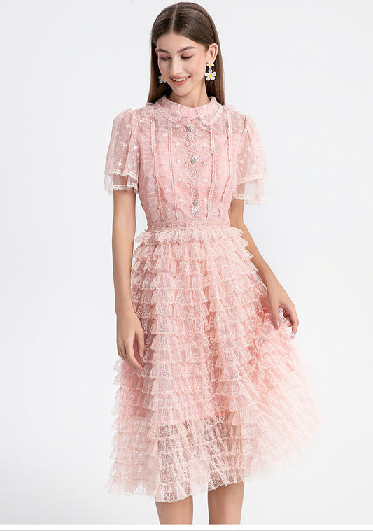 Pudra Pembe Fırfırlı Dantel Elbise – Bebek Yaka & Kısa Puff Kol