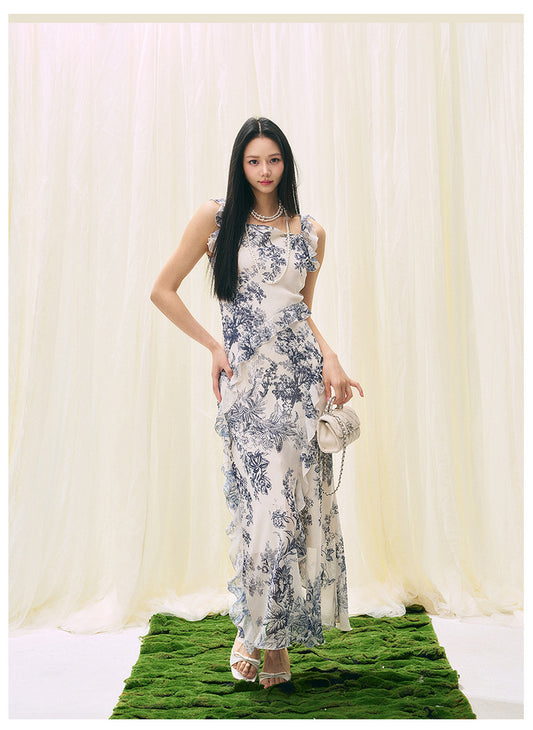 Çiçek Desenli Askılı Bol Kesim Retro Yaz Elbisesi