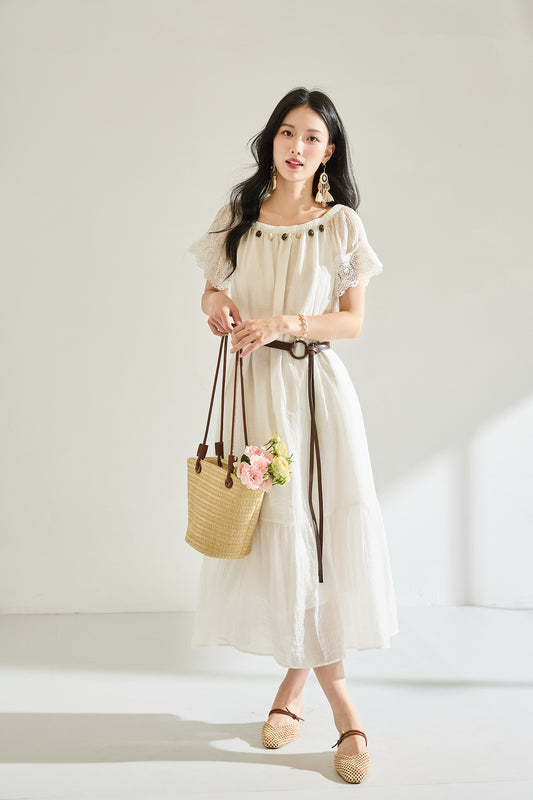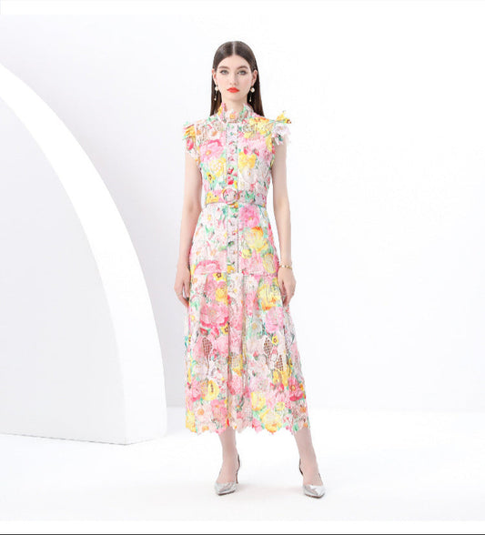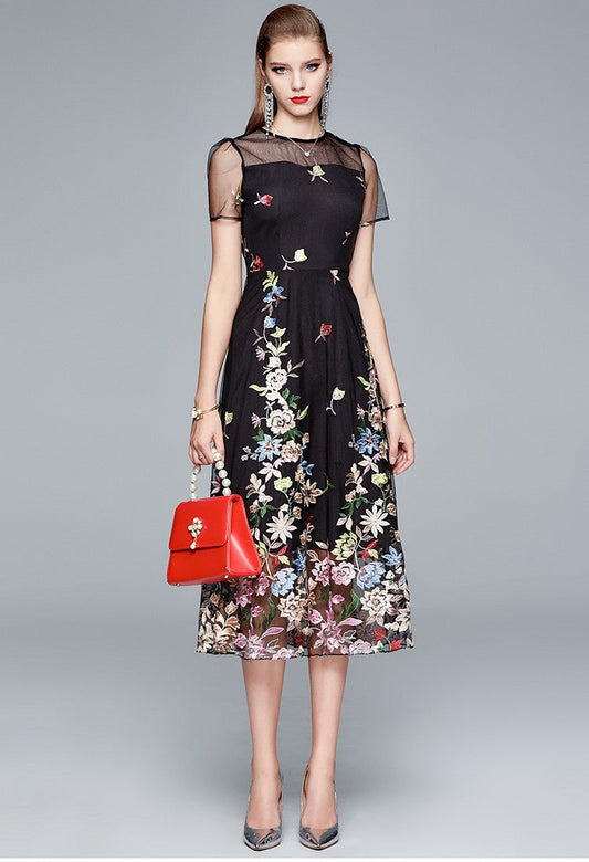 Renkli Nakış Detaylı Yüksek Bel Zarif Yaz Elbisesi