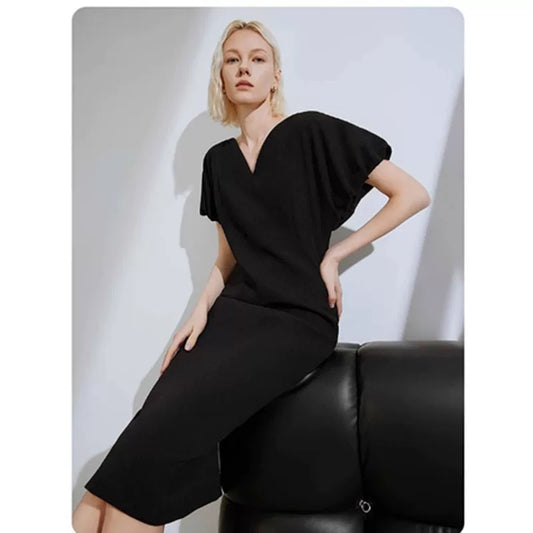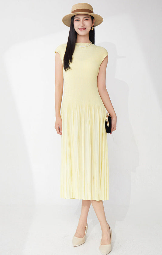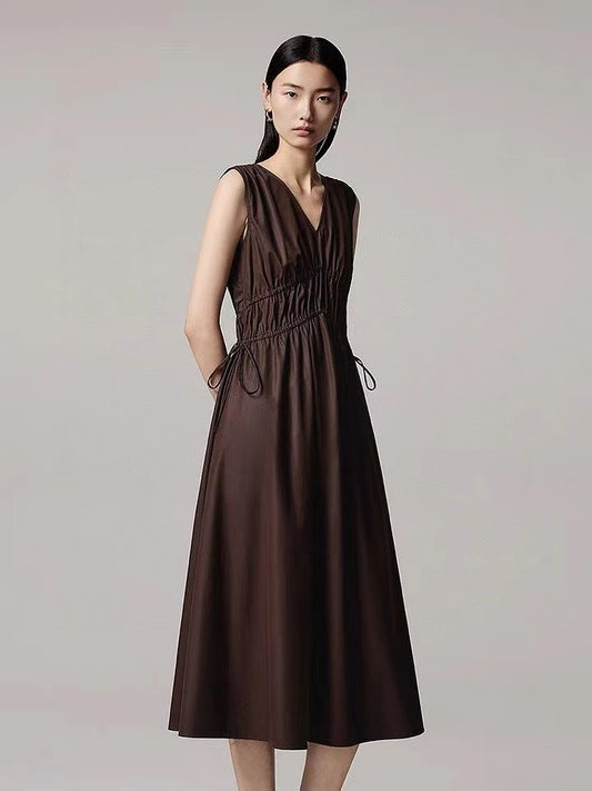 25% İndirimPliseli Kahve V-Yaka Kolsuz Midi Elbise