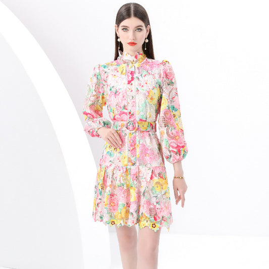 Dantel Desenli Yüksek Yaka Uzun Elbise – Retro ve Bel Oturtmalı