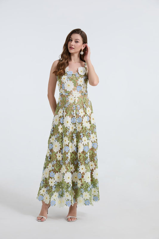 21% İndirimÇiçek İşlemeli Askılı Yeşil Uzun Elbise