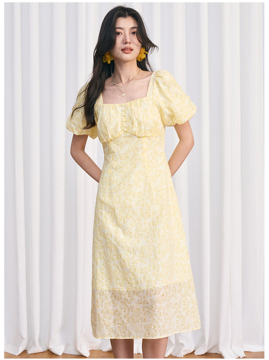 Kare Yaka Kabartma Çiçek Desenli Sarı Kız Elbisesi