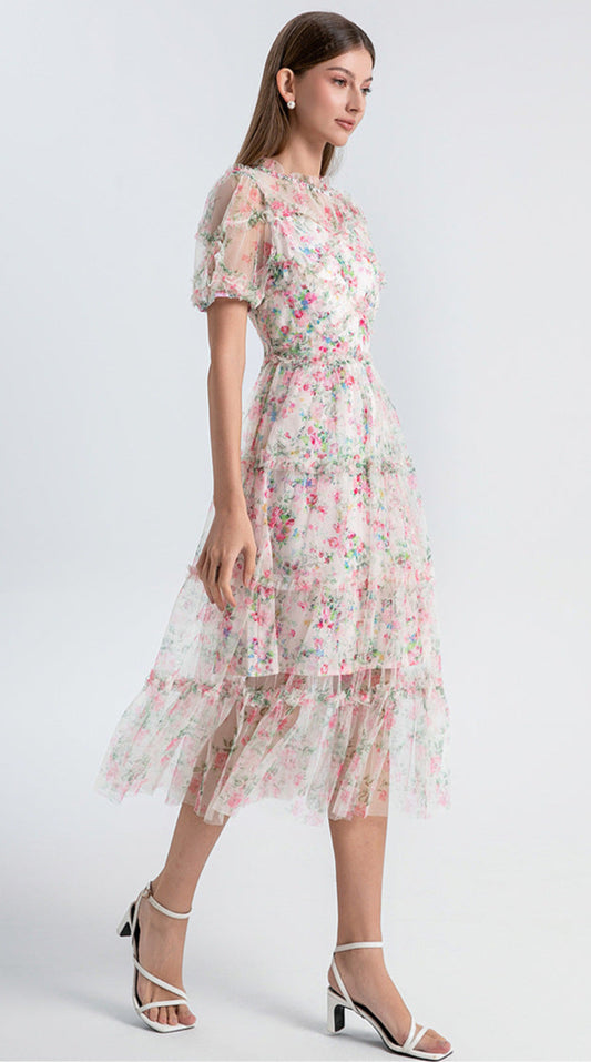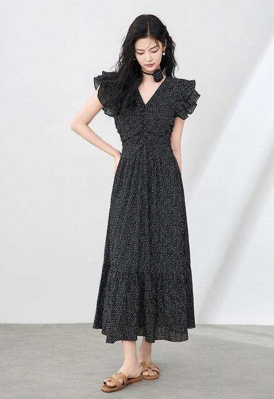 Romantik Puantiye Kolye Detaylı Lotus Kol Midi Elbise