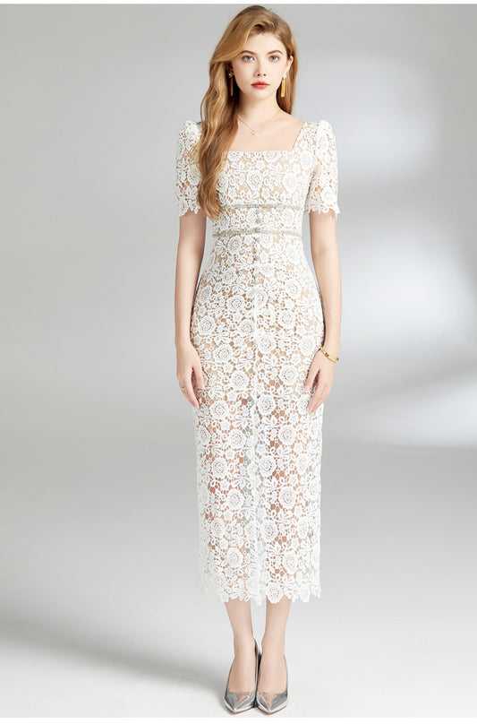 21% İndirimKare Yaka Çiçek Dantelli Vücudu Saran Elbise