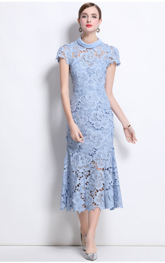 Dantel Detaylı Yüksek Yaka Kısa Kollu Yazlık Midi Elbise