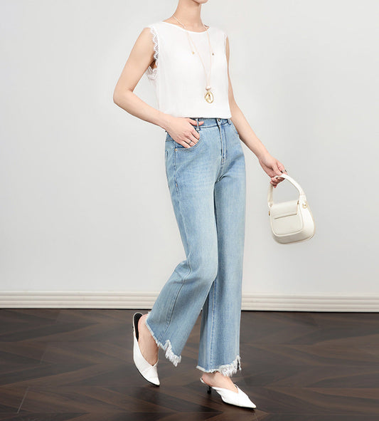 Dantel Detaylı Açık Mavi Yüksek Bel Bol Paça Jean
