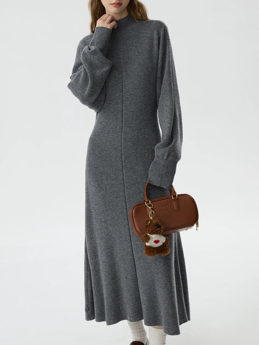 %33.8 Yün Yarım Yüksek Yaka Gri Örgü Yarasa Kollu Elbise (Şal Hariç)