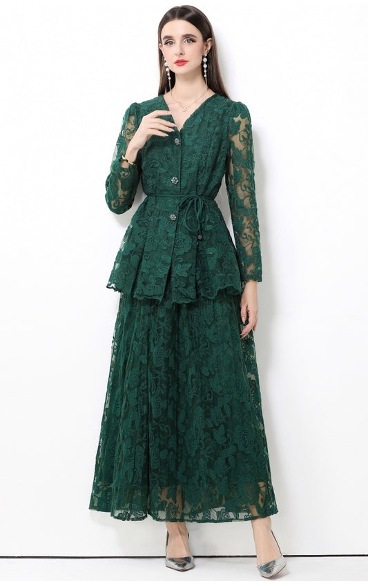 Fransız Stil Dantelli V-Yaka Uzun Kollu Üst & Etek İki Parça Takım
