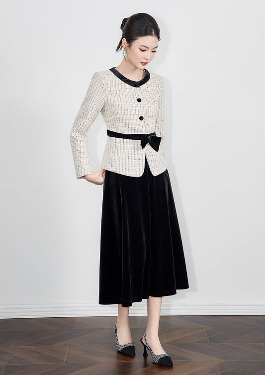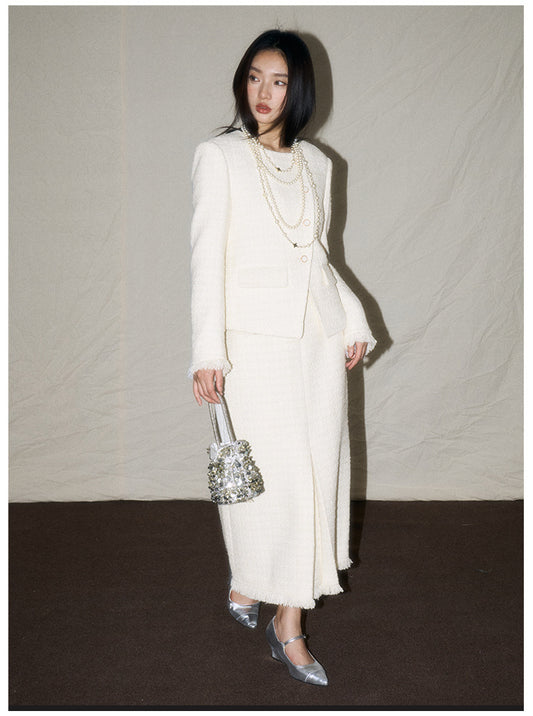 Beyaz Yünlü Fransız Ceket & Midi Etek Takımı