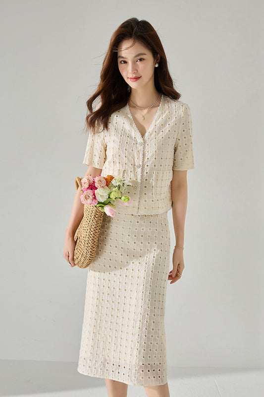 Zarif Geometri Ekru Kısa Üst ve Midi Etek Tencel Takım