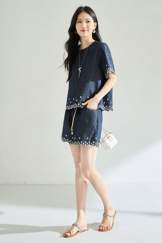 Nakış Detaylı Denim Şortlu Takım