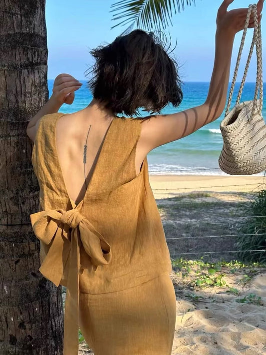 21% İndirimZarif Fiyonklu Kolsuz Keten İkili Takım