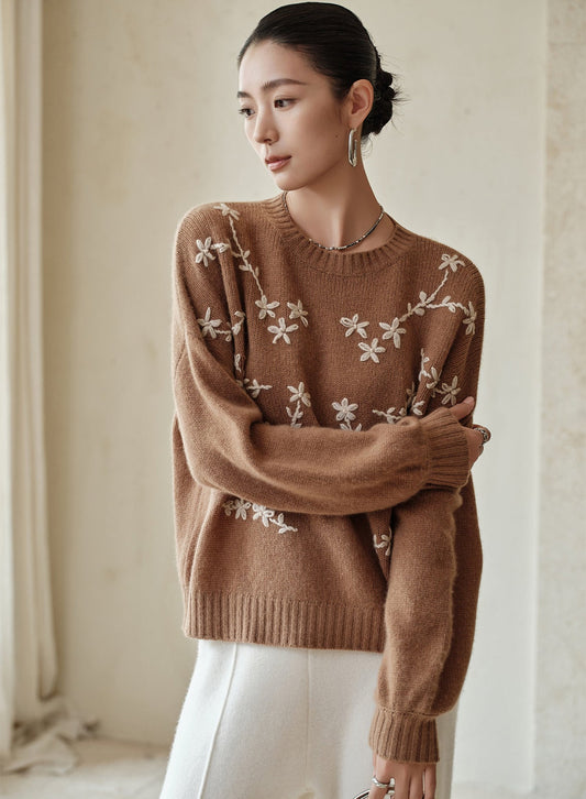 İşlemeli %100 Saf Kaşmir Yuvarlak Yaka Kazak