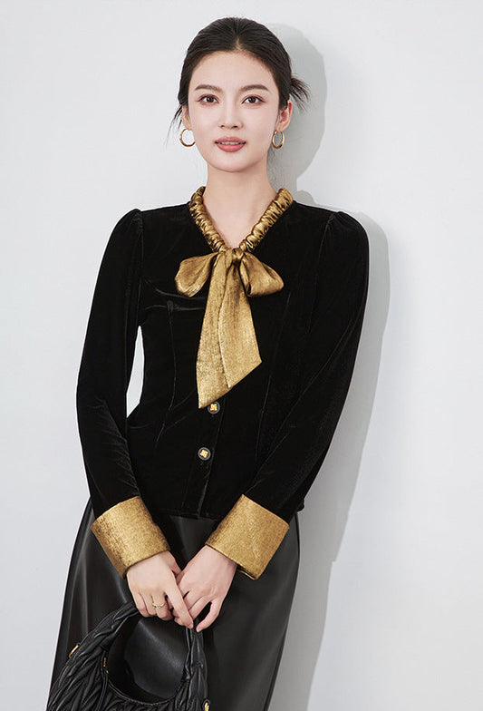 Kadife Kontrastlı Fransız Stili Fiyonk Detaylı İnce Gösteren Bluz