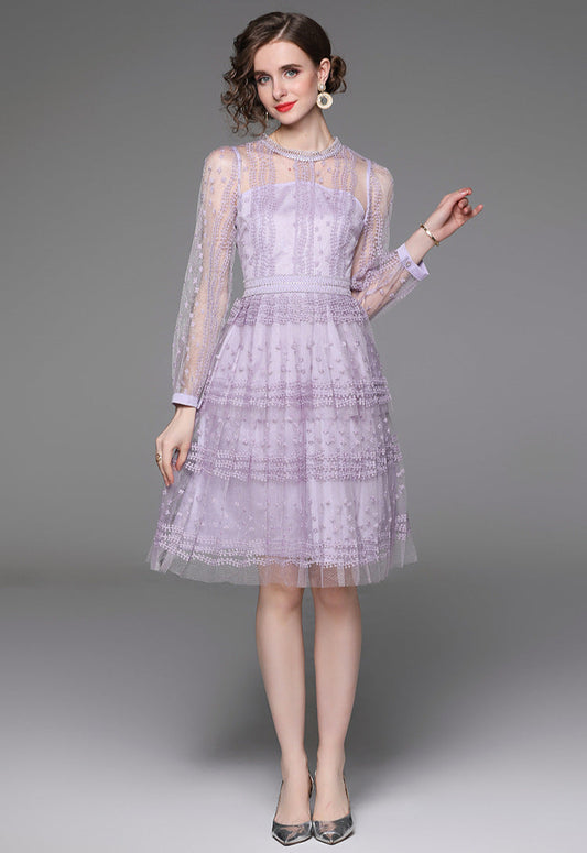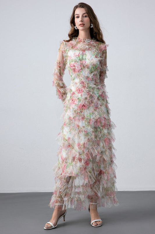 Dantel Desenli Yüksek Yaka Uzun Elbise – Retro ve Bel Oturtmalı