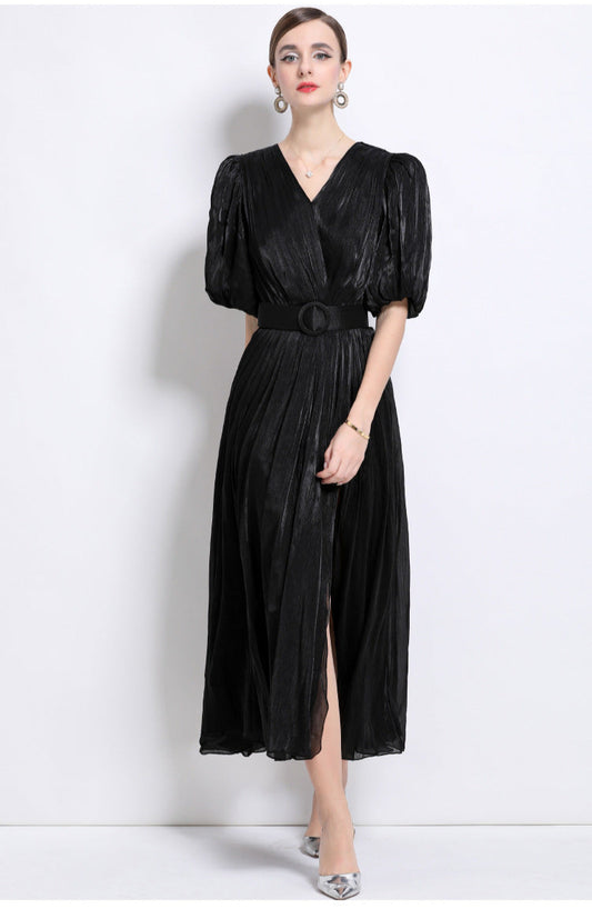 Işıltılı Balon Kolu Büzgülü Uzun Elbise