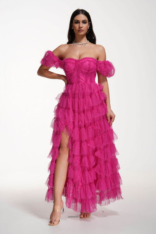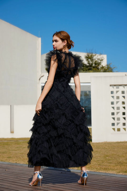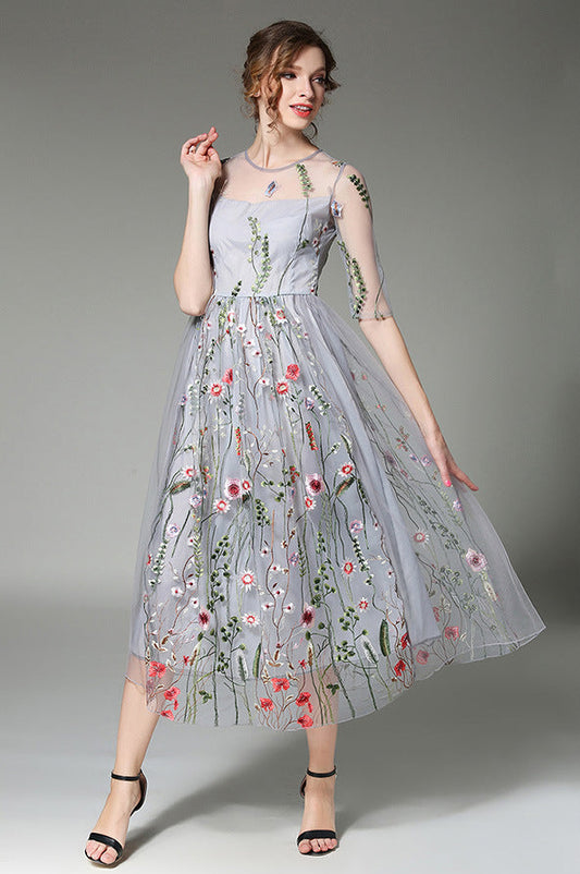 İşlemeli Fransız Çiçek Tül Uzun Elbise