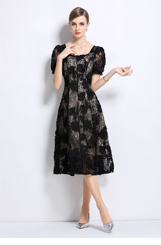 Fransız Zarafeti Dantel Nakışlı Yüksek Belli Uzun Elbise