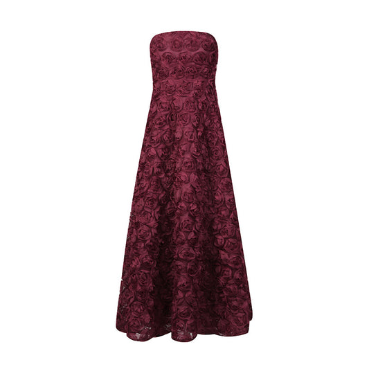 Bordo 3D Çiçek Detaylı Straplez Uzun Elbise