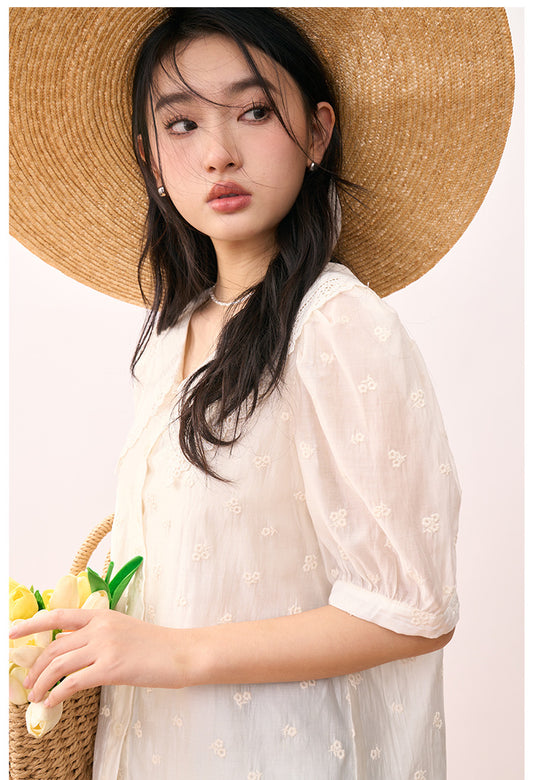 İşlemeli Bebek Yaka Kısa Kollu Ekru Gömlek