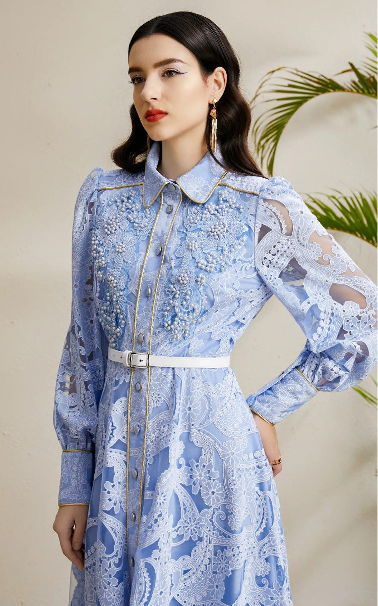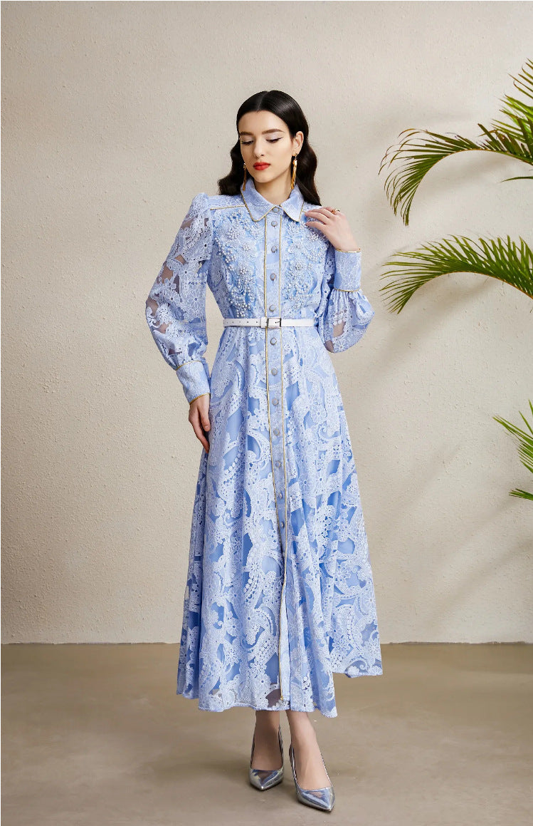 Zarif ve lüks detaylarıyla dikkat çeken bu elbise, ilkbahar ve sonbahar sezonu için mükemmel bir tercihtir. Altın şeritli yaka tasarımı, boncuklu korsajı ve iç içe geçmiş dantel dokusu ile asil bir görünüm sunar. Geniş kol kesimi hareket özgürlüğü sağlarken, uzun ve dökümlü etek formu feminen bir siluet oluşturur.