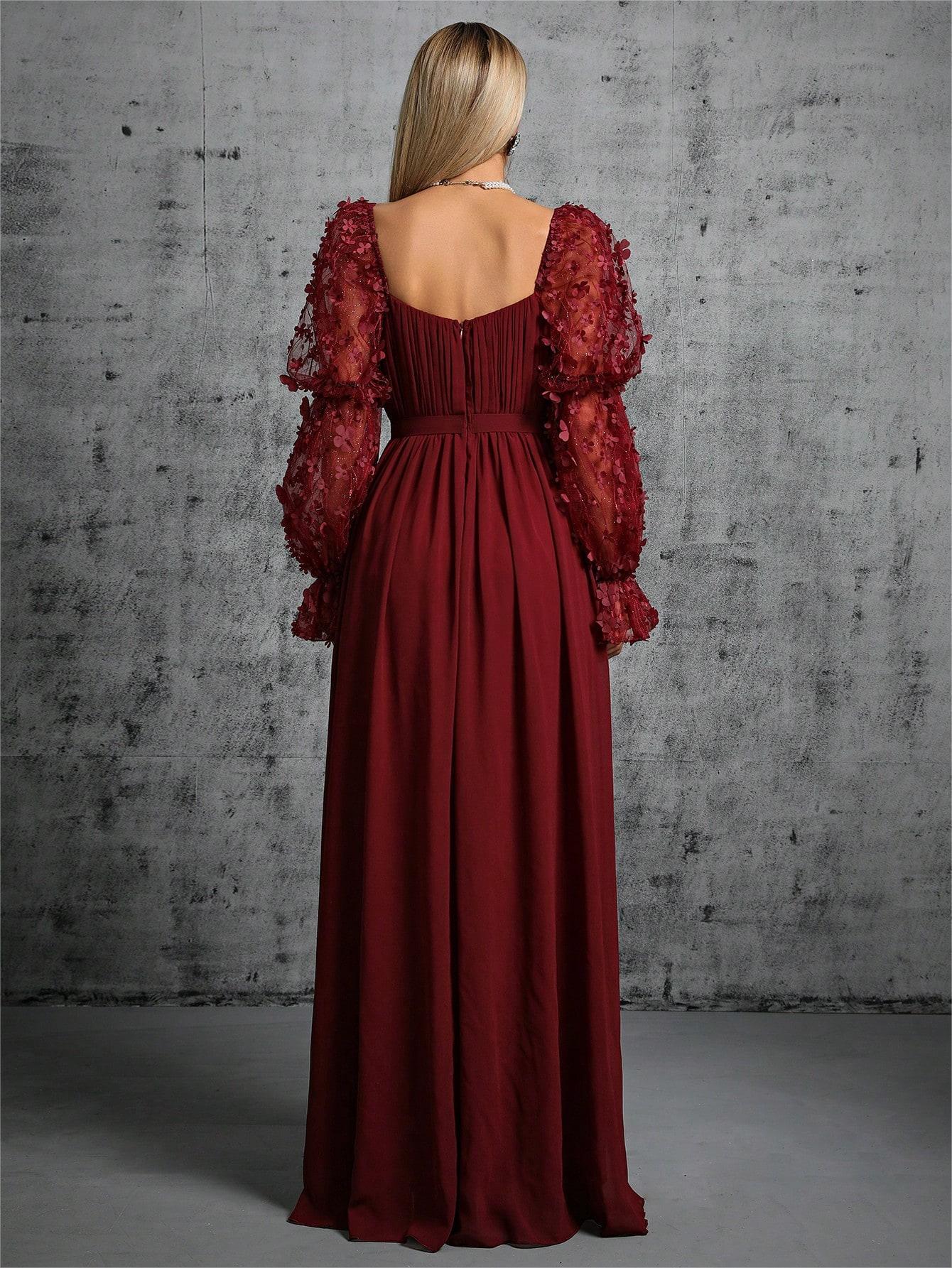 Fransız Zarafeti Dantel Nakışlı Yüksek Belli Uzun Elbise