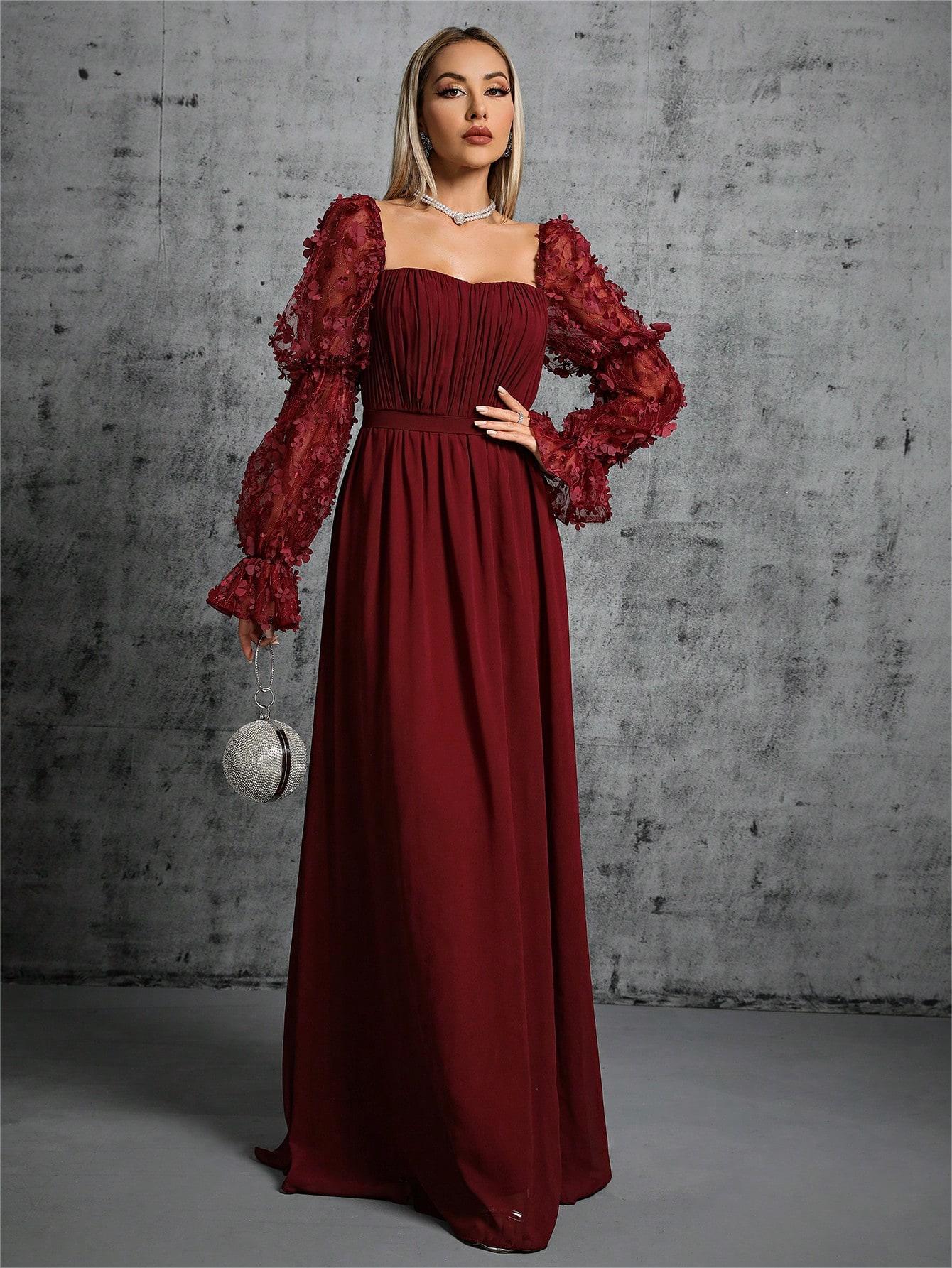 Kare yaka tasarımı, omuz ve boyun hattını estetik bir şekilde vurgularken; A-kesim etek formu vücut hatlarını dengeli ve zarif biçimde tamamlar. Arkadaki sırt dekoltesi, elbiseye modern ve çekici bir dokunuş katar. Uzun kollu yapısı sayesinde hem şık hem dengeli bir duruş sunar.