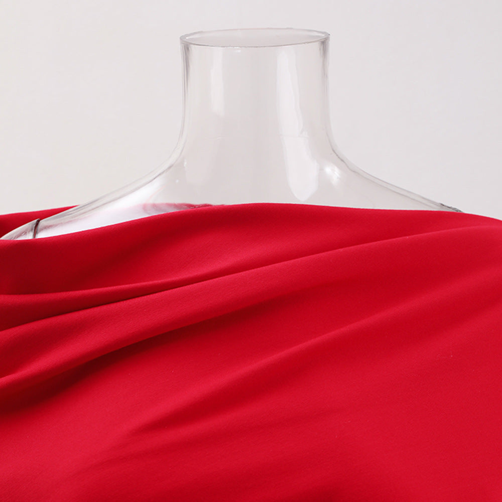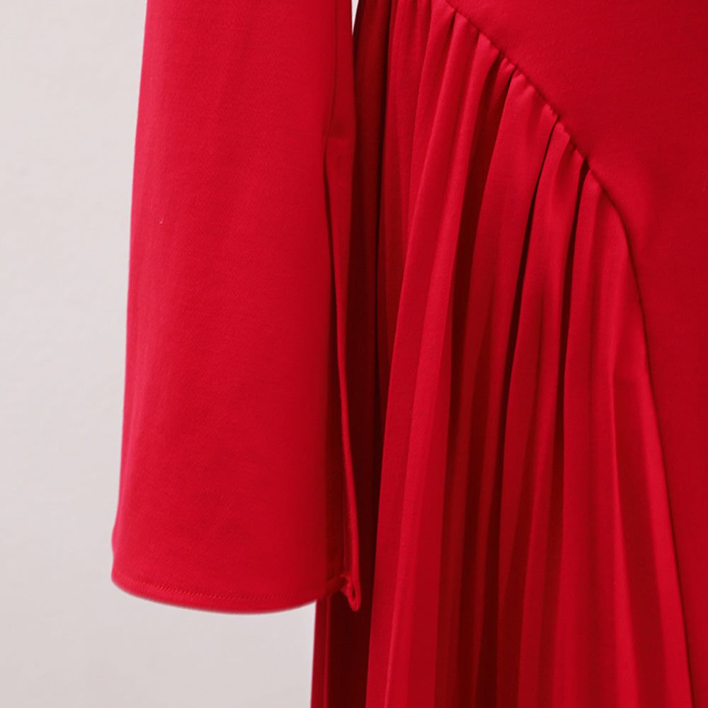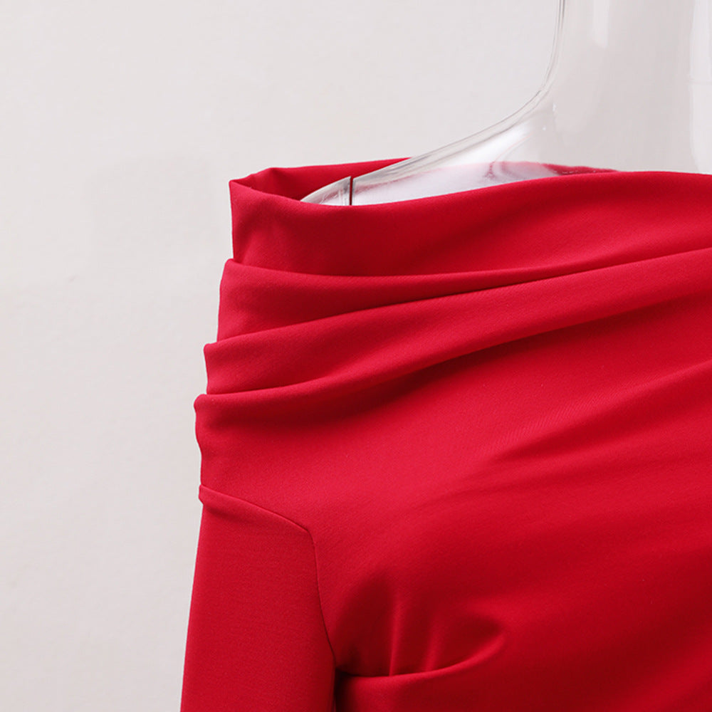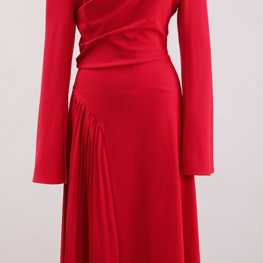 Zarafetiyle göz kamaştıran bu uzun kırmızı elbise, asimetrik etek kesimi ve tek omuz detaylarıyla stilinizi bir üst seviyeye taşıyor. Yüksek belli yapısı, belinizi ince gösterirken dökümlü uzun etek kısmı ise şıklığınıza hareket katıyor. Uzun kollu tasarımı ve slant yaka formu sayesinde sonbahar ve kış davetleri için ideal bir seçim. Hem özel günlerde hem de şık akşam yemeklerinde etkileyici bir görünüm sunar.