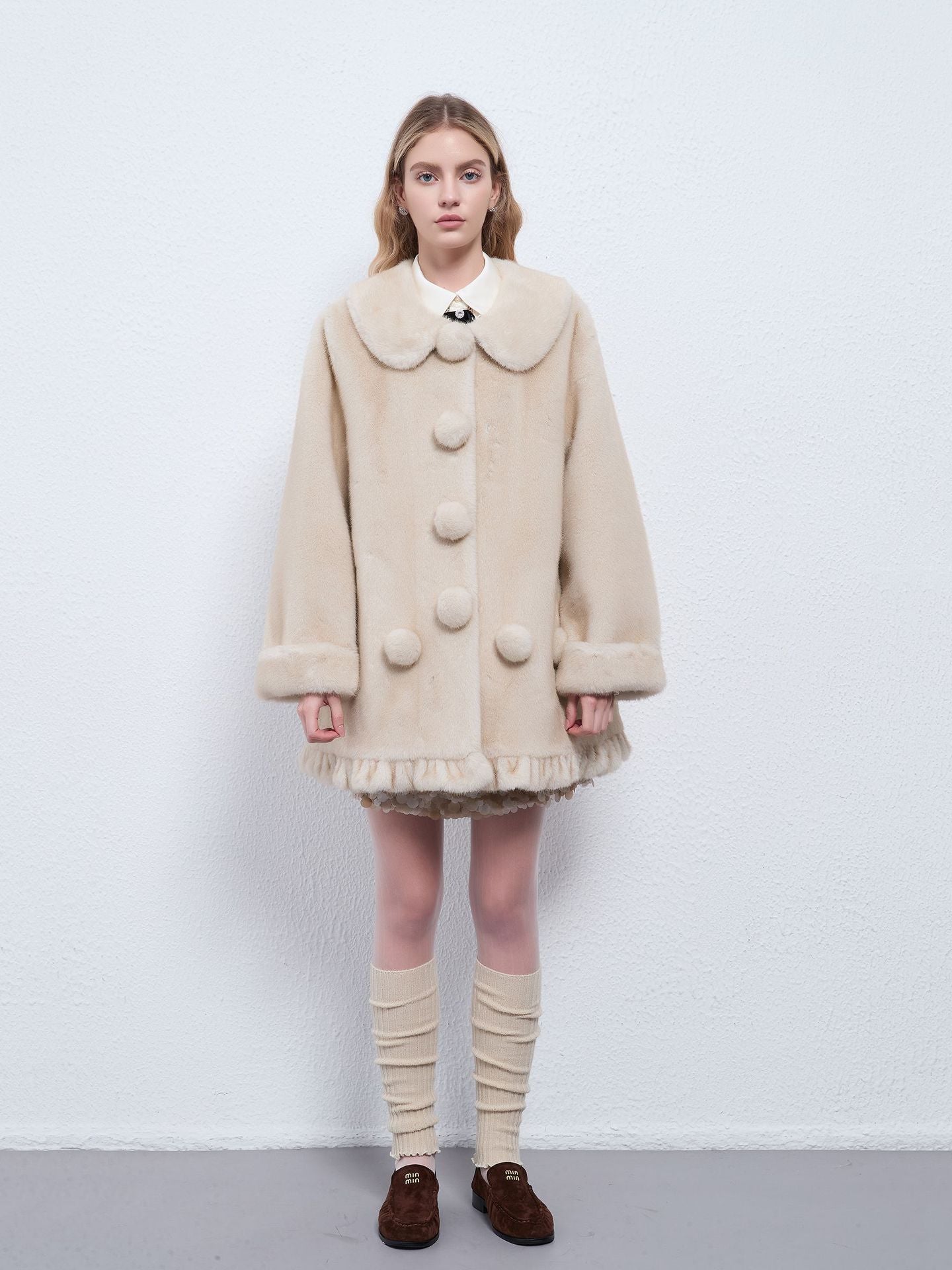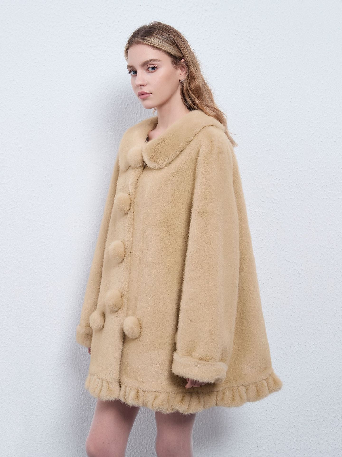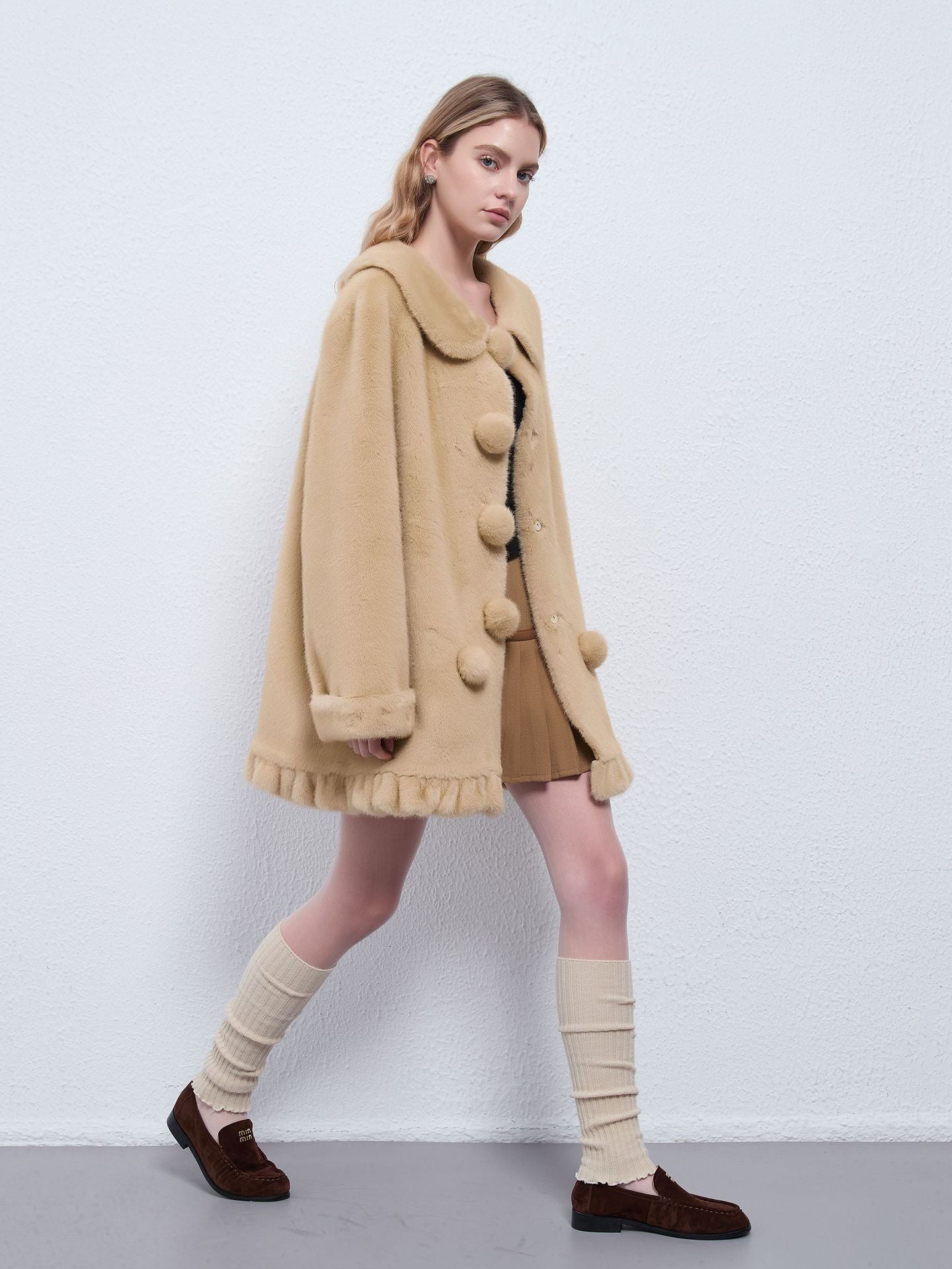 Yumuşacık dokusuyla dikkat çeken bu kürk kaban, Fransız vintage tarzının zarif yorumudur. Oversize kesimi, büyük yuvarlak düğmeleri ve fırfır etek ucu detayıyla feminen bir görünüm sunar. İç ısıtan pelüş kumaşı sayesinde hem şık hem konforludur. Geniş bebek yakası, pastel tonuyla birleşerek romantik bir kış stili oluşturur.
