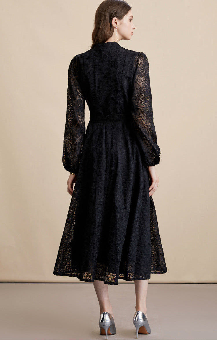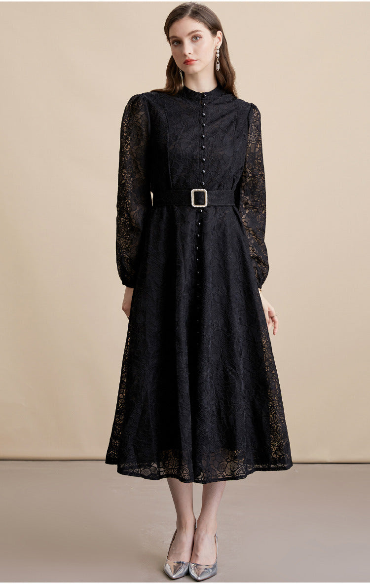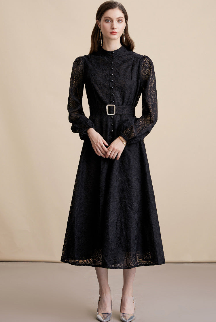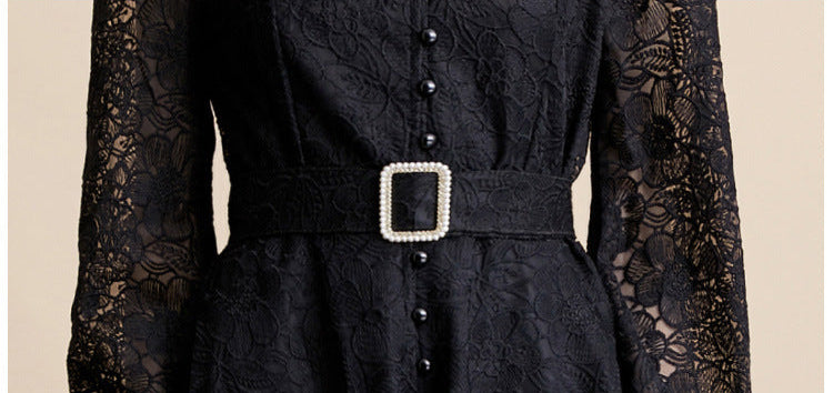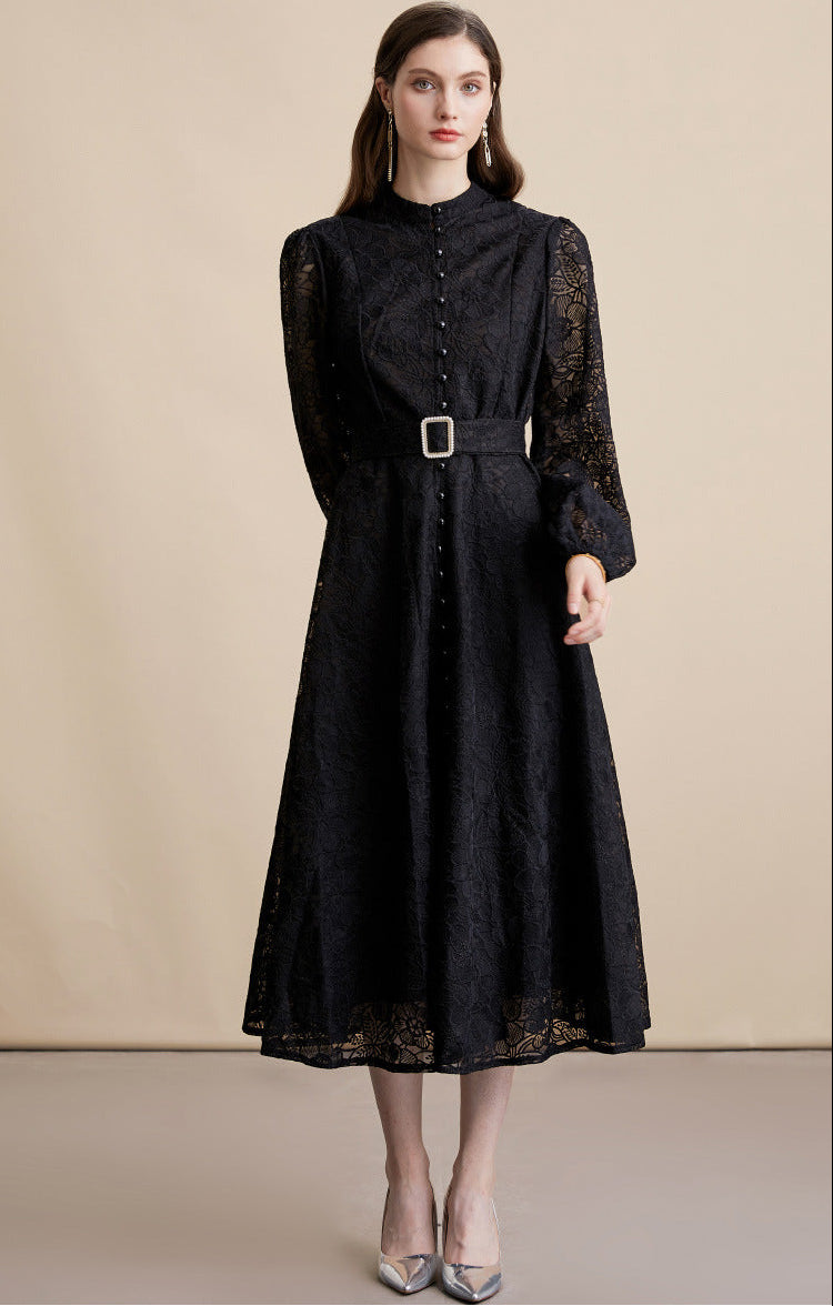 Dantel işleme detayları elbisenin her noktasında zarafetle kendini gösterirken, tek sıra düğme kapama ve bel kemeri modeli tamamlar.