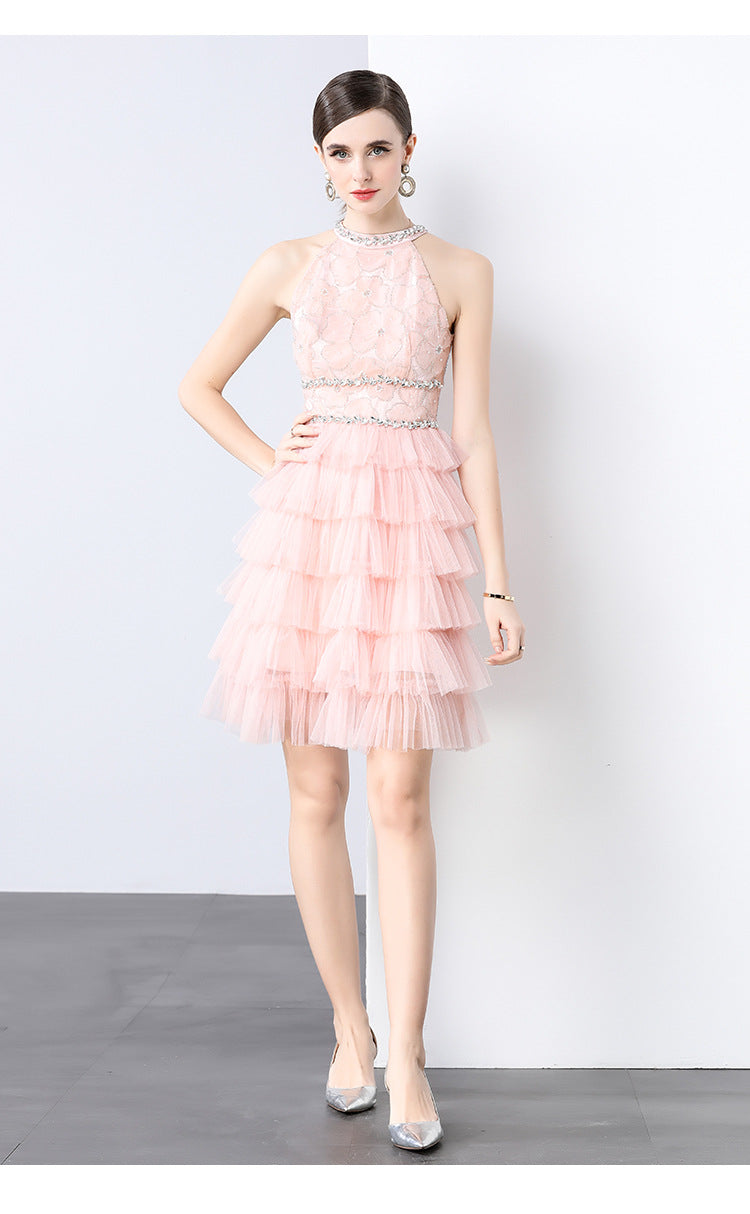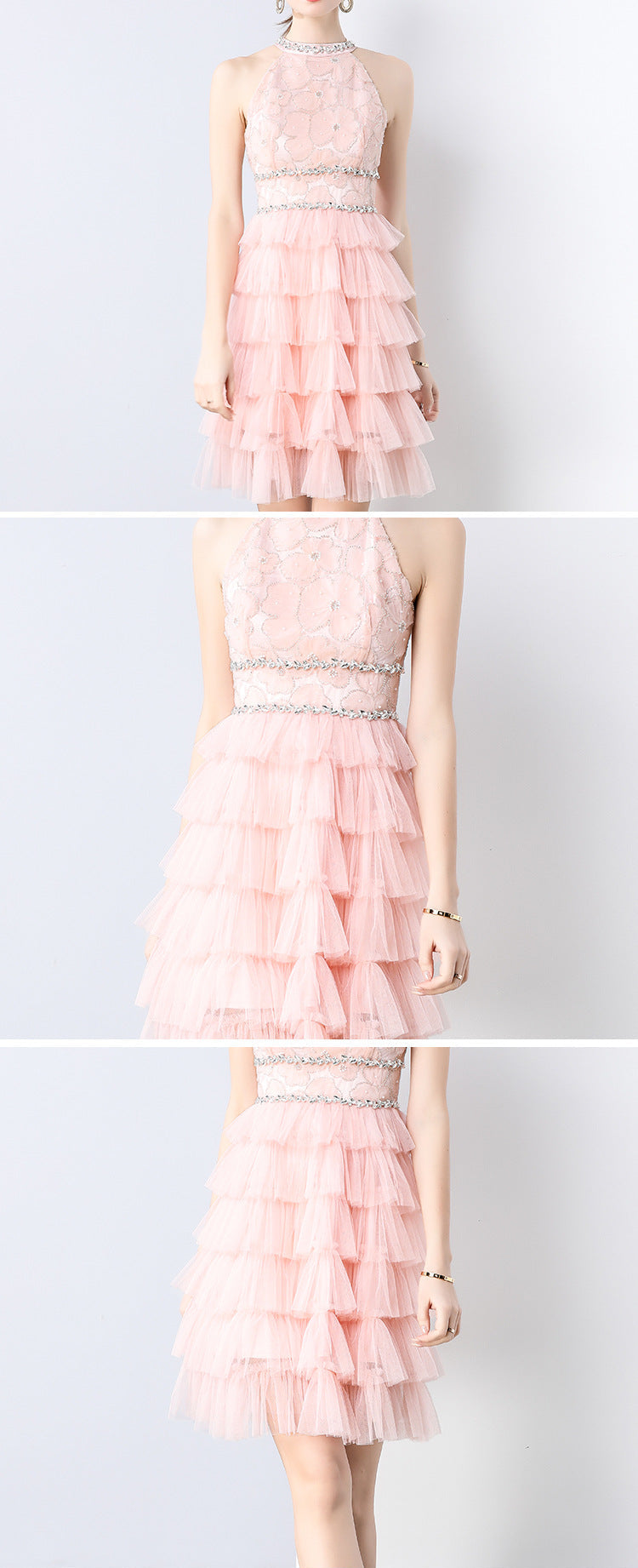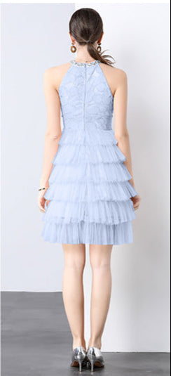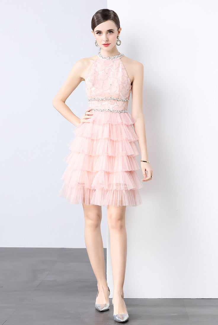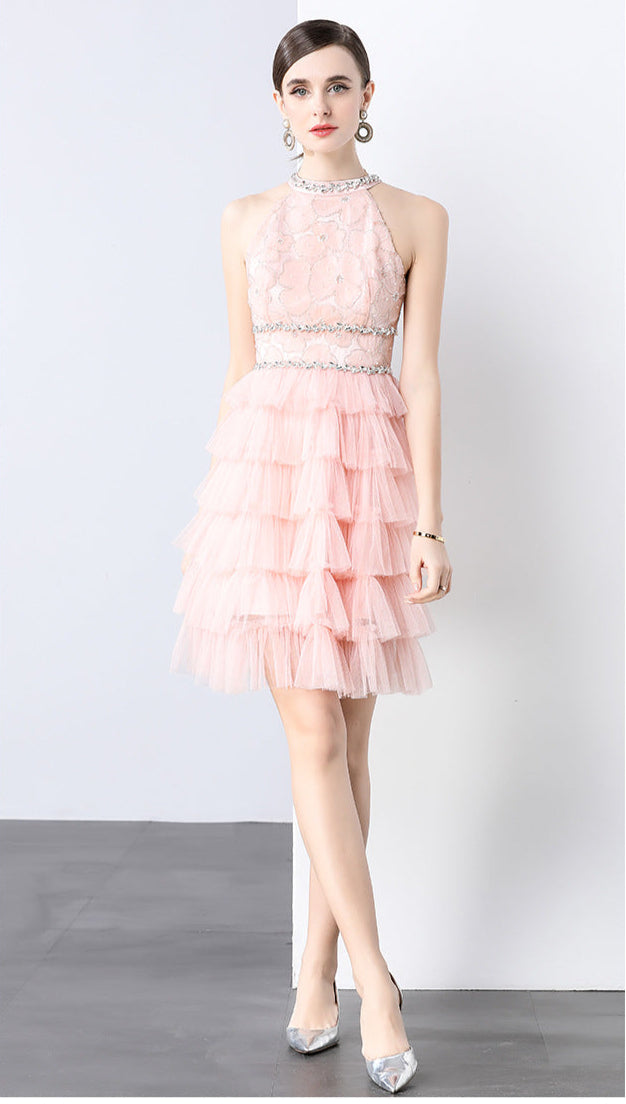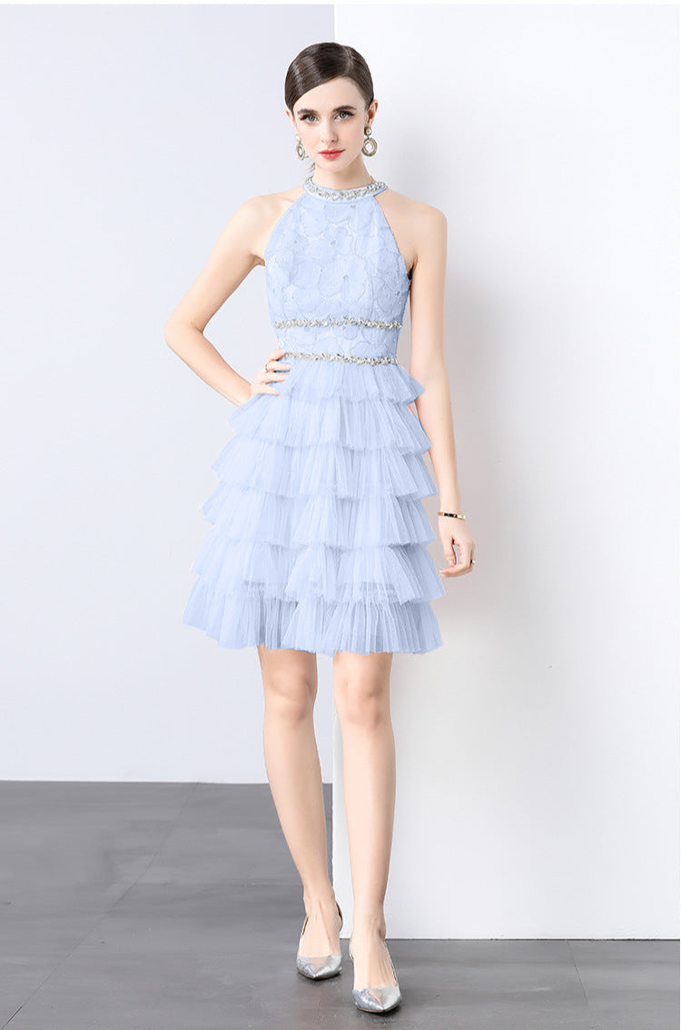 Kristal Taşlı Halter Yaka Kat Kat Tül Elbise